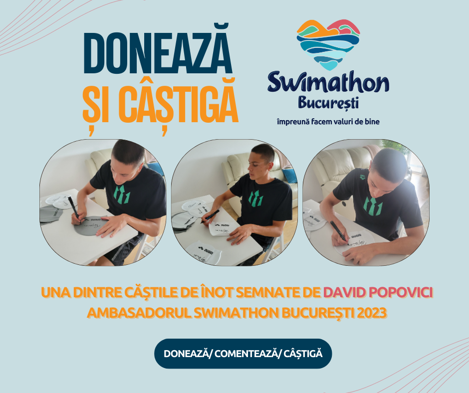 Donații pentru Swimathon București: Câștigă o cască de înot semnată de ambasadorul campaniei, David Popovici!